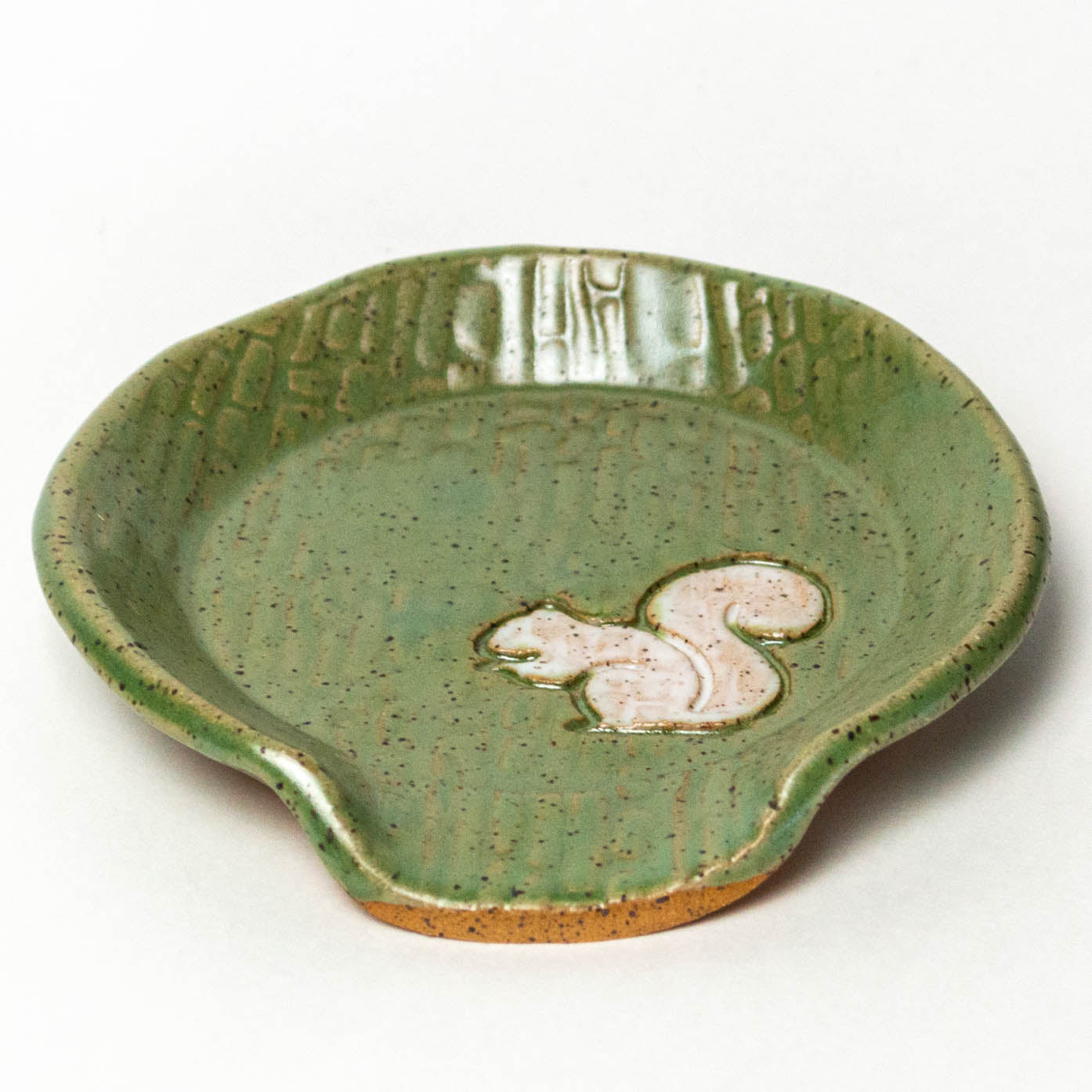 This beautiful stoneware ceramic spoon rest features a white squirrel design on a green background, hand-built and hand-glazed in Ohio, USA. Measuring approximately 4¼" wide, it’s the perfect way to keep your counters tidy while cooking, all while adding a touch of handmade charm to your kitchen.