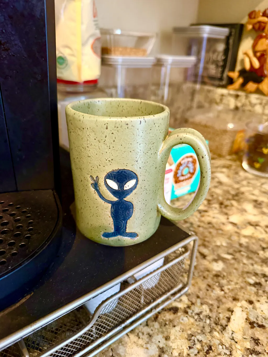 Each mug is handmade, so no two are ever exactly alike. Expect slight variations in shape, glaze, and color—each one with its own rustic charm and a little extraterrestrial peace and personality.