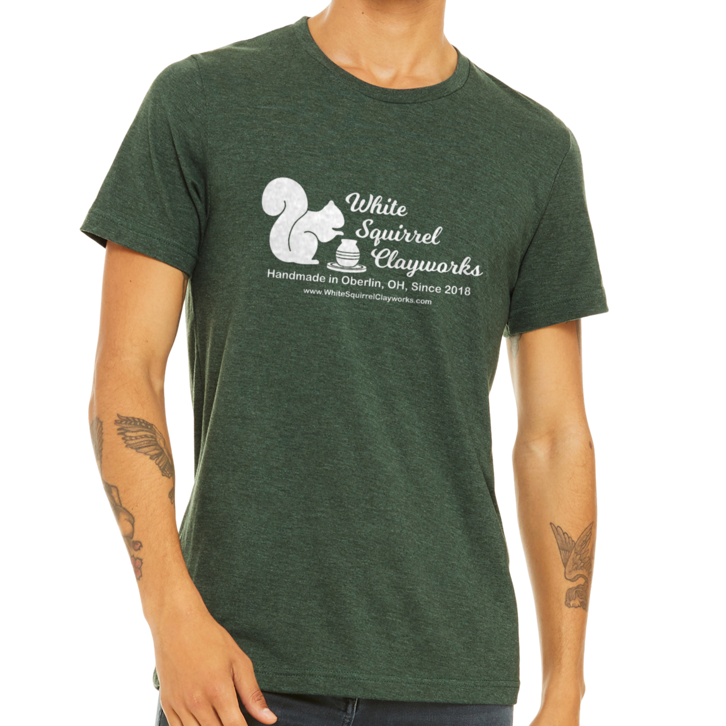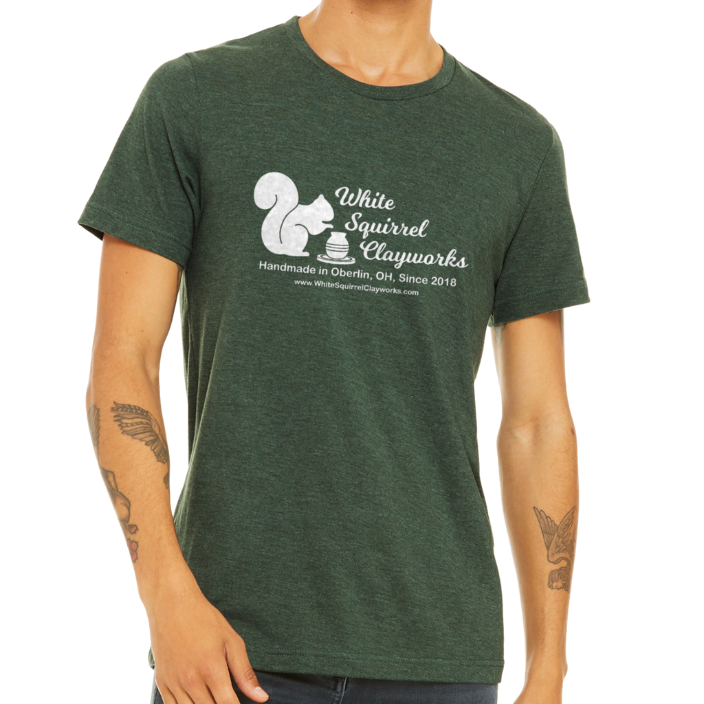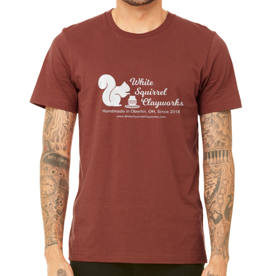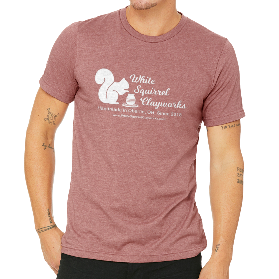 Soft t-shirt with the White Squirrel Clayworks logo on it. Unisex sizing. 52% cotton, 48% polyester. Choice of color: Rust, Heather Forest, Heather Mauve