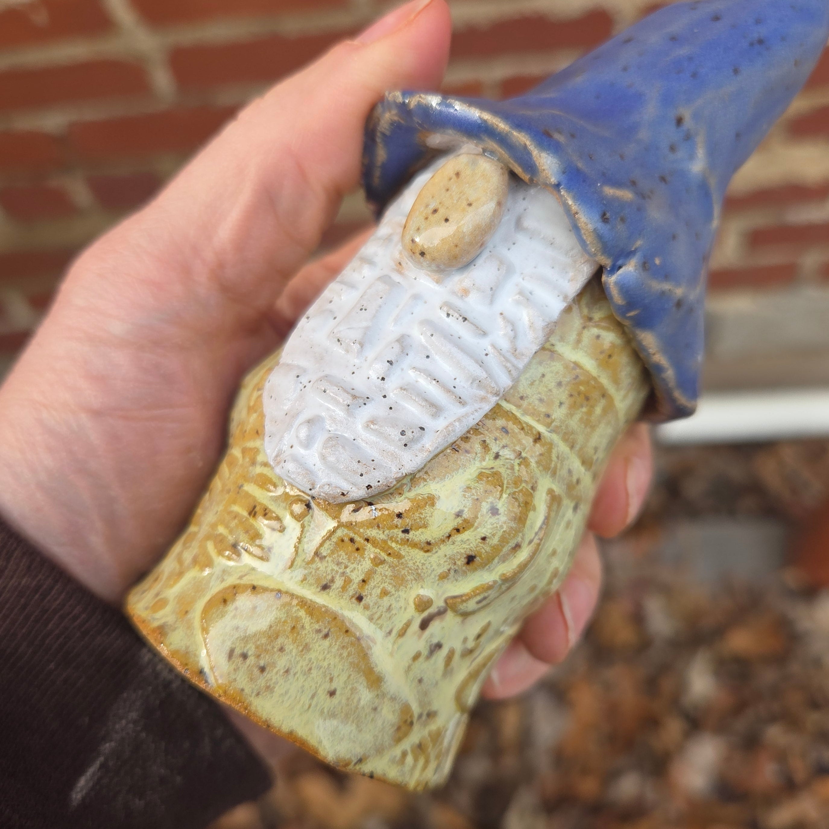 Lovingly handmade and glazed in Oberlin, Ohio, each gnome is crafted from sturdy stoneware clay and stands approximately 8–10 inches tall, depending on the whimsy of their hat’s curl! No two are ever alike—every gnome has their own quirky charm and personality.