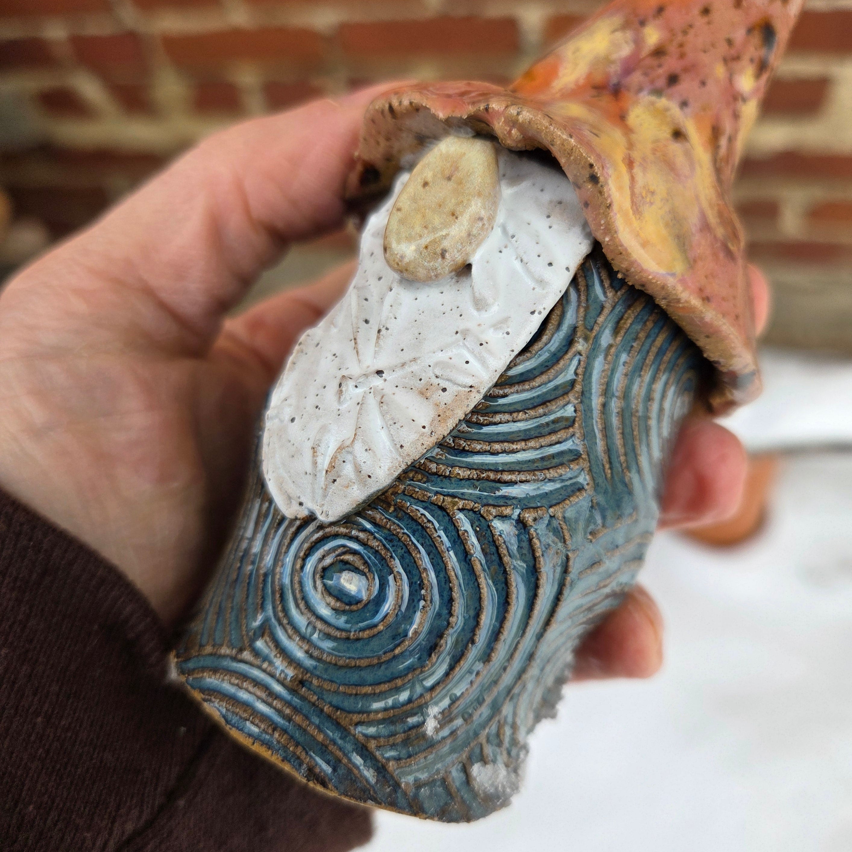 Lovingly handmade and glazed in Oberlin, Ohio, each gnome is crafted from sturdy stoneware clay and stands approximately 8–10 inches tall, depending on the whimsy of their hat’s curl! No two are ever alike—every gnome has their own quirky charm and personality.