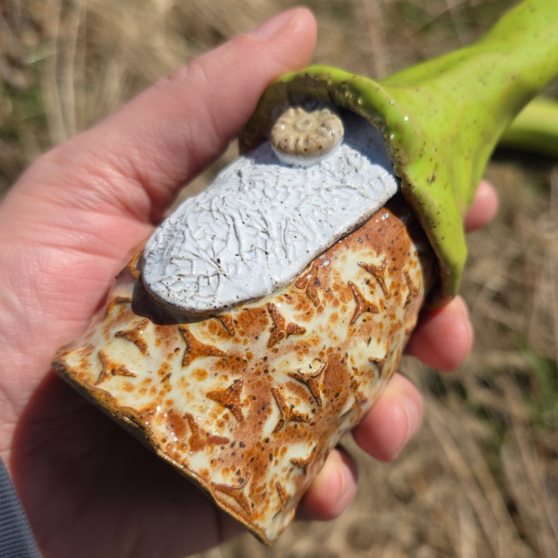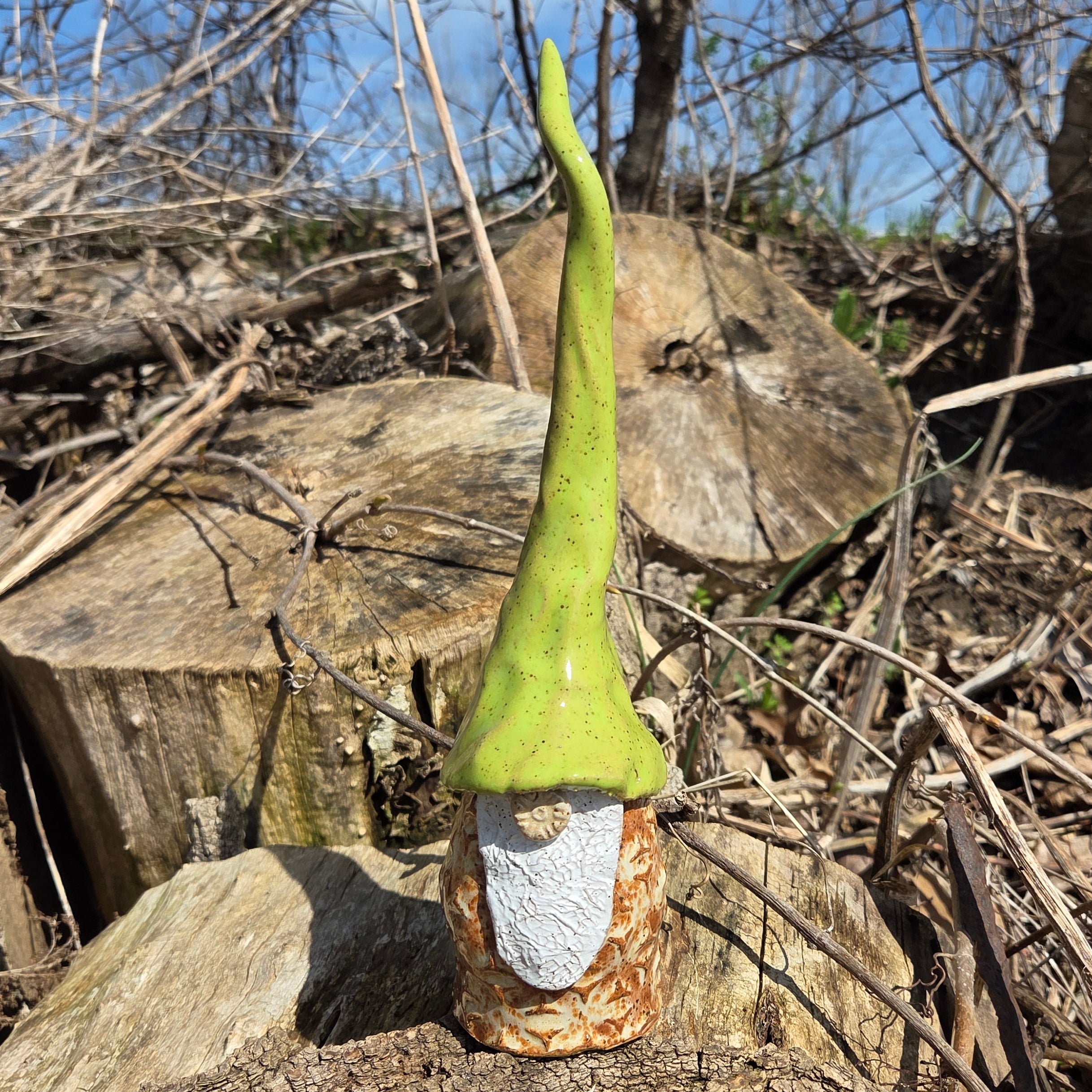 Lovingly handmade and glazed in Oberlin, Ohio, each gnome is crafted from sturdy stoneware clay and stands approximately 8–10 inches tall, depending on the whimsy of their hat’s curl! No two are ever alike—every gnome has their own quirky charm and personality.