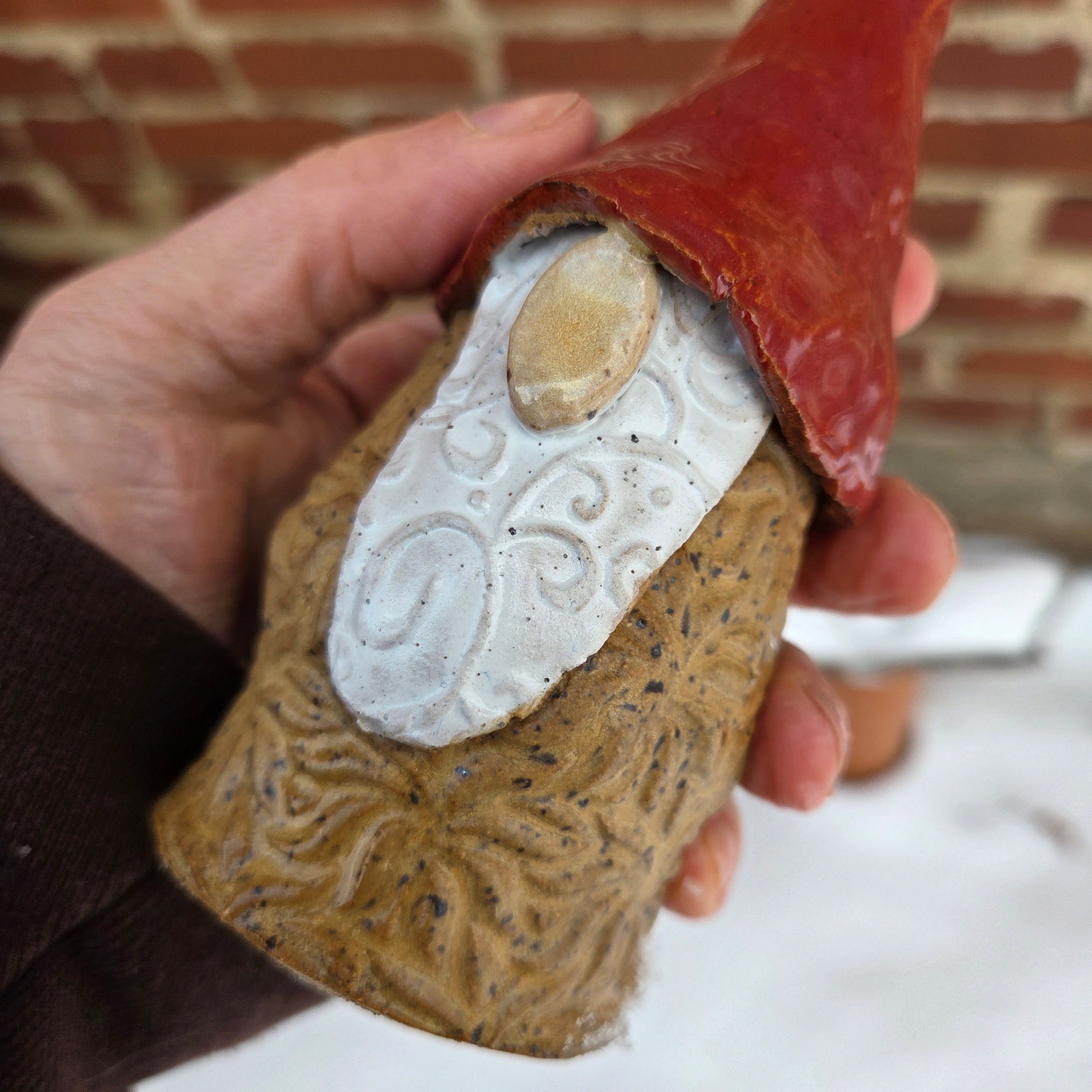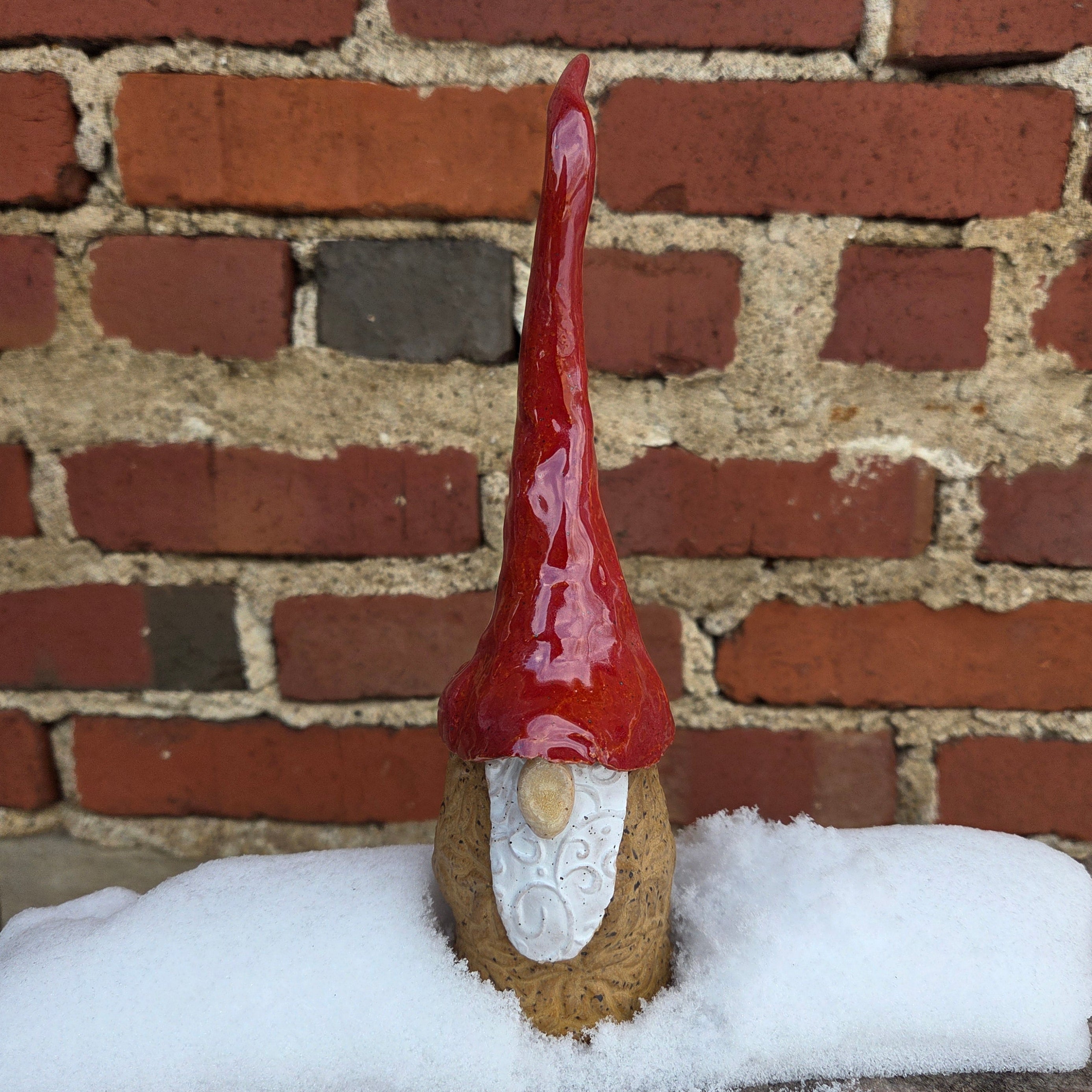 Lovingly handmade and glazed in Oberlin, Ohio, each gnome is crafted from sturdy stoneware clay and stands approximately 8–10 inches tall, depending on the whimsy of their hat’s curl! No two are ever alike—every gnome has their own quirky charm and personality.