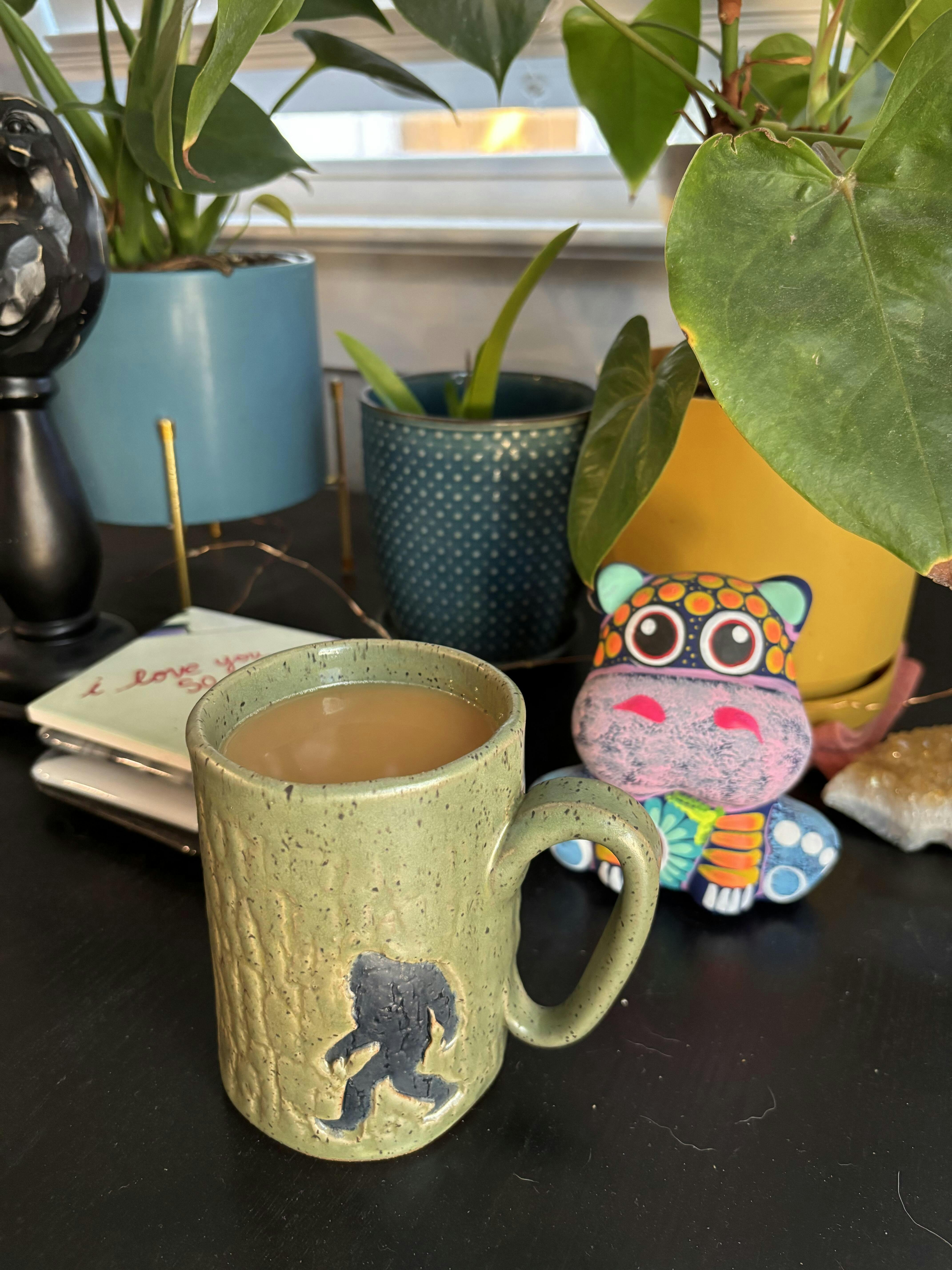 Embrace a bit of woodland mystery with this beautiful Sasquatch (Bigfoot) mug! Hand-built and hand-glazed with care in Oberlin, Ohio, this stoneware mug holds approximately 14 oz.—perfect for your favorite coffee, tea, or cocoa. Measuring about 3 1/4 inches wide and 4 3/4 inches high, it’s food, dishwasher, and microwave safe for everyday convenience. Each mug is uniquely handmade, ensuring no two are ever exactly the same, with charming variations in color and detail. A delightful companion for any Bigfoot believer’s cozy sips! 🦶☕🌲