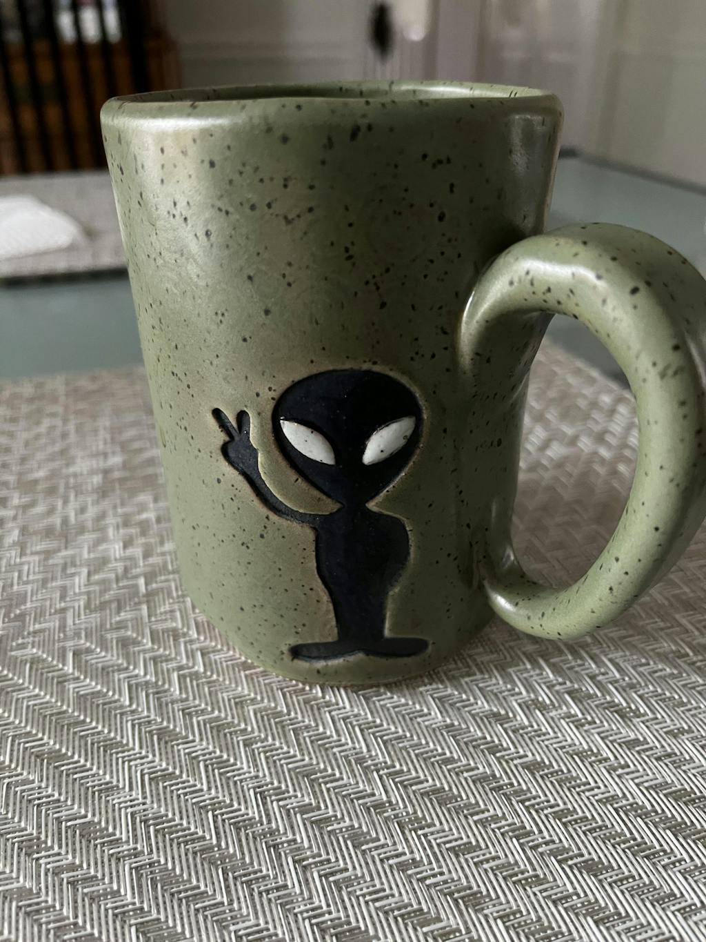 Each mug is handmade, so no two are ever exactly alike. Expect slight variations in shape, glaze, and color—each one with its own rustic charm and a little extraterrestrial peace and personality.